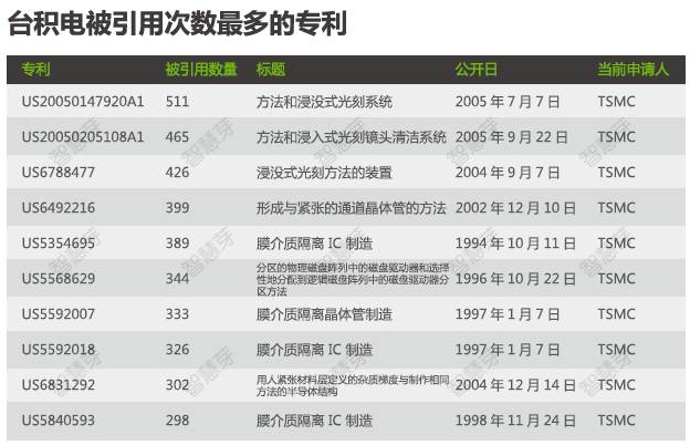 查看台积电的重点专利,可以一目了然看到Top10被引用次数最多的专利如下图,其中05年公开的一条关于方法和浸没式光刻系统的专利排名首位,这也正是台积电近年来在不断研发创新的领域。
