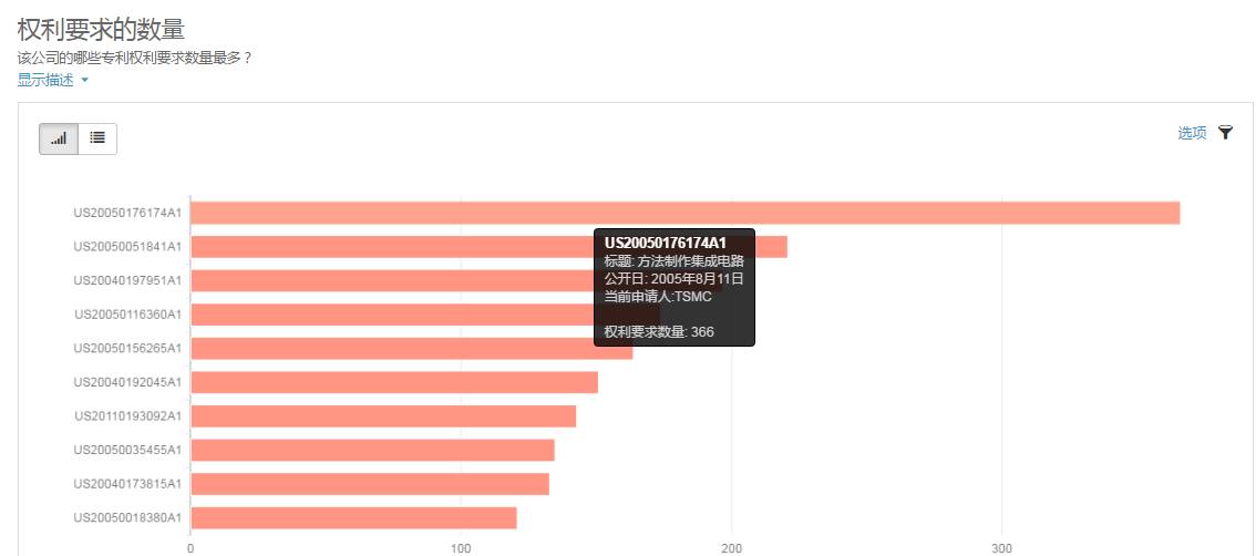 例如台积电的一条US20050176174A1集成电路制造方法专利,权利要求数量高达366条,远超于其他专利条目。